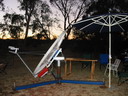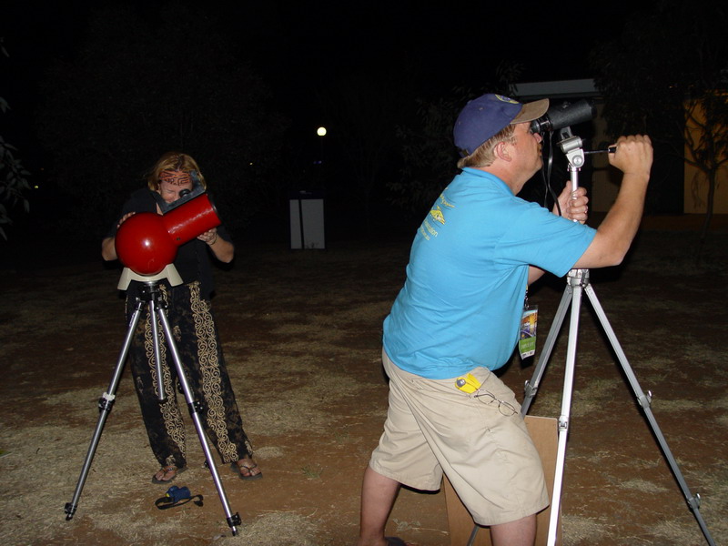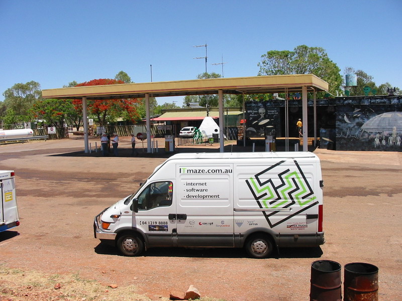 Wednesay, October 22 - Day 4Today Sungroper left the Tennant Creek control point and drove using solar power until around 2:30pm when it trailered to Aileron Roadhouse. Weather conditions have improved dramatically, and we drove today under cloudless skies, although a few continue to lurk on the horizon south of us. Andrew has been improving the telemetry software we use to plan our day's strategy. Dennis has been offering very valuable suggestions as to possible improvements to the calculations. Colin is fully recovered and was eager to get some more driving time in today. We are now have our third observer, Neil Burman, (who was the observer on Mad Dog's team when they were picked up by a willy-willy and thrown into a roadsign) Today we drove the Sungroper trailer through a willy-willy. We have now passed past the geographical centre of Australia (which would now make us Australia's most central internet Cafe), and also did a driver change at Wycliffe Wells, Australian capital of UFO sightings. Some teams even donned aluminium hats to celebrate the event. The Sungroper Internet Cafe is now at 22.6431 degrees South 133.3450 degrees East 677m elevation. Tonight the team are watching "The Dish", courtesy of Onno and ITmaze's video projector. Conditions are also ideal for stargazing, and the telesto Tomorrow Sungroper will drive into Alice Springs. We plan to be camping at Stuart's Well tomorrow night. Sadly Dennis will be flying out from Alice Springs to return to his work commitments, and will be greatly missed by both the Sungroper and Puerto Rican teams, where he has been of great assistance. We will attempt to post a full list of distances covered so far tomorrow night. Other teams ----------- The Dutch Nuna II covered 3,010 kilometres in 30 hours and 54 minutes, shaving 1 hour and 45 minutes off their 2001 record. Although they did roll one of their crew vehicles South of the Aileron Roadhouse, there were no serious injuries. (They also sported a sign on one of their support vehicles saying "We don't brake for kangaroos") Aurora has also finished the race, having passed the end of timing at 5:07pm although will have to cross the finish line itself tomorrow morning. The MIT team (Sungroper's pit neighbours) finished 20 minutes behind them. French team Helios suffered a broken suspension strut which they've repaired and are now back on the road again. Heliodet is stopped 18 km North of our position and is expecting to make the Alice Springs control stop before 1pm tomorrow. More WSC gossip will no doubt be available tomorrow when we reach the control point. There is another WA car in the demonstration class, a biodiesel powered 4WD.